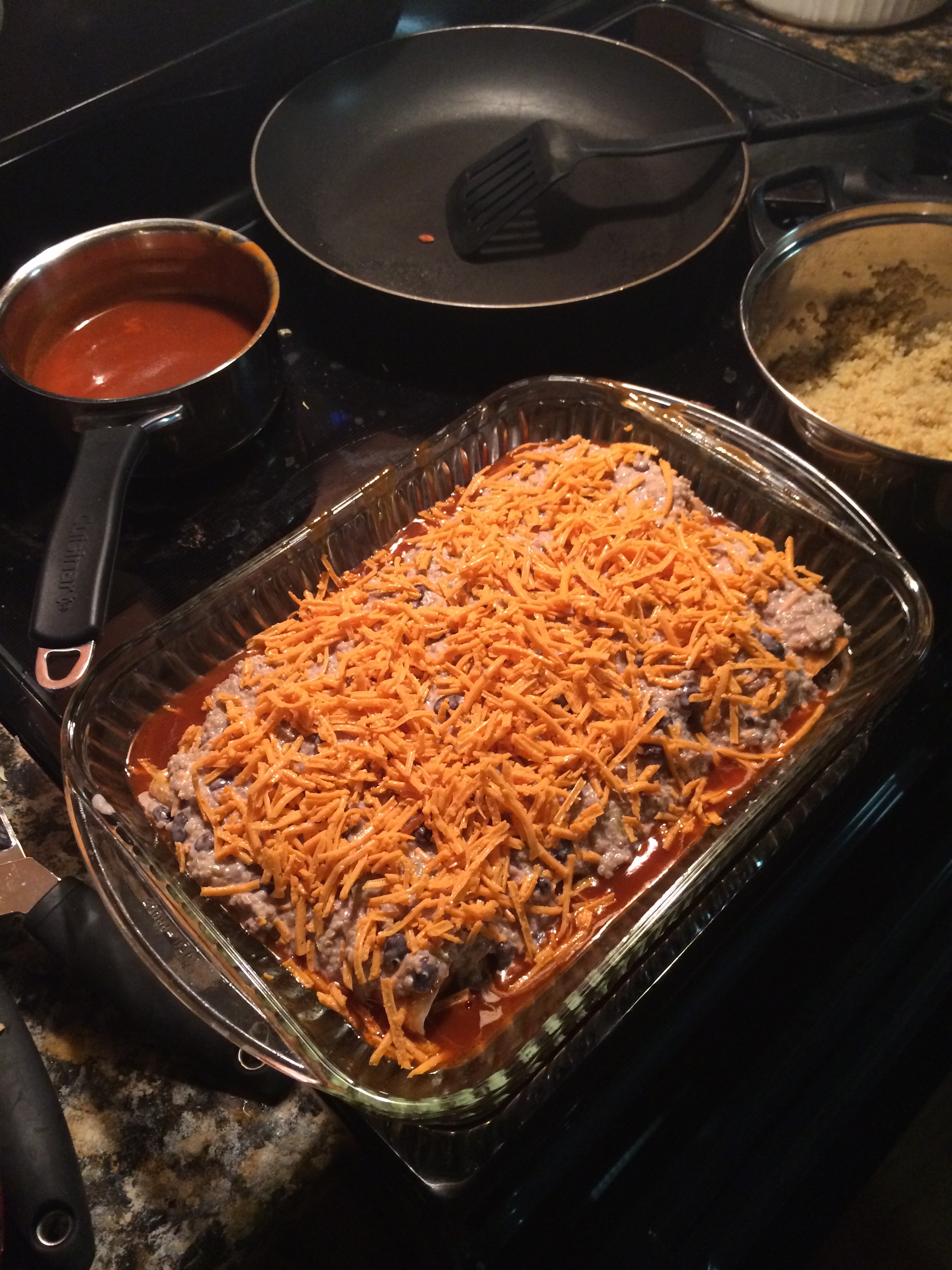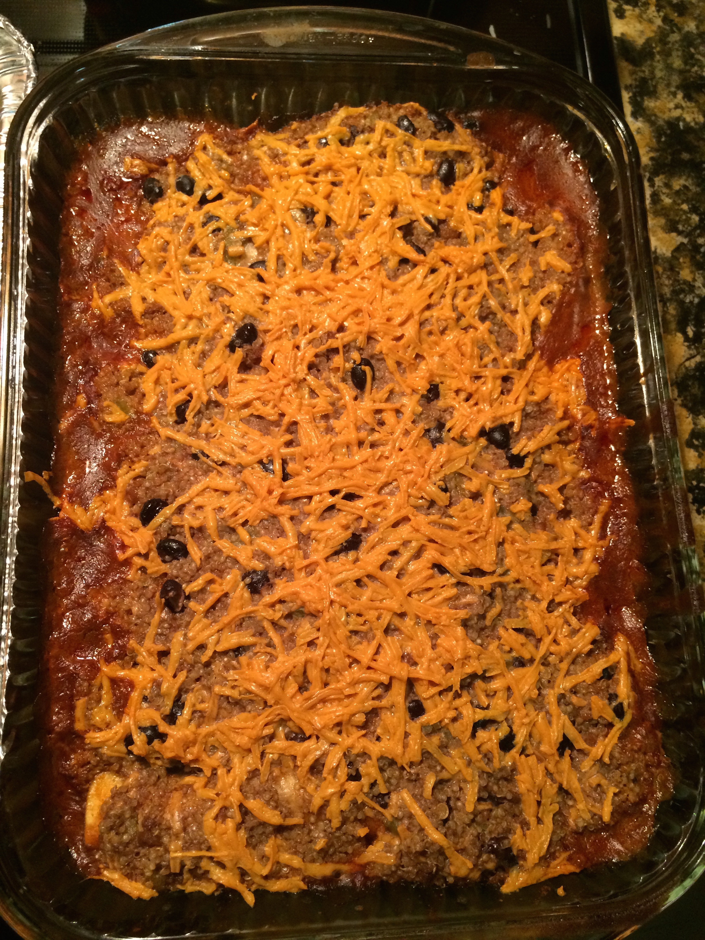 So off the top of my head this is how I made it. I cooked the griller crumbles (Morningstar product) for a min, season it with garlic and onions. I then mixed, chili beans, griller crumbles, sour cream, chopped green chiles, cheese, and corn in bowl. I mixed it well an tasted it a little bit to see if I liked the taste. I added some salt, pepper, and cumin. While I was doing that, I cooked the Quinoa. BTW, this was my first time cooking Quinoa and I learned that less is way more!! Lol Quinoa expands!! Once the enchilada sauce was warm enough, I pour the sauce into the pan and coated it. I then took the tortilla wraps and filled them with the mixture from the bowl and rolled them up. The open side flat onto the pan. Once I filled the pan with the wraps, I then pour more enchilada sauce on top of the enchiladas, and then poured the Quinoa on top. Once that was evenly spread, I poured cheese on top. Placed it in the oven for about 15 minutes and TA-DA, yummy enchiladas!!!!